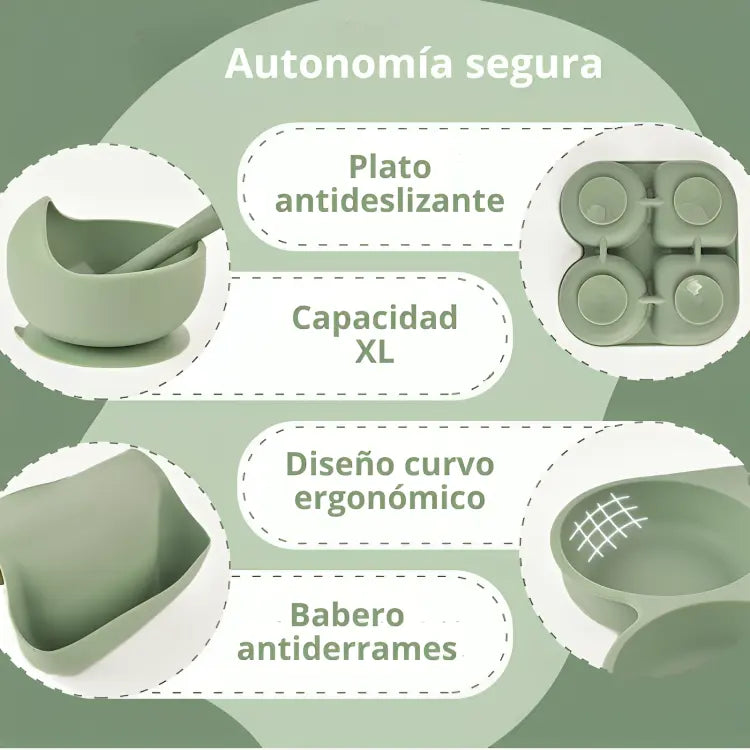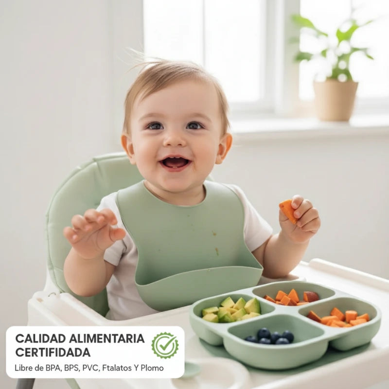 Hecho con silicona alimentaria premium. Es suave con sus encías y seguro con su comida. Para que tú tengas tranquilidad, y él, todo el cuidado que merece.